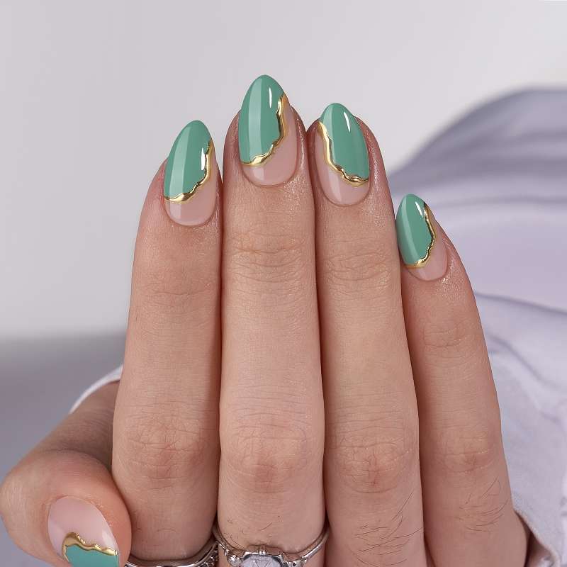 Our part green and part nude gel press-on nails with a touch of gold brings a modern edge to the classic French manicure.