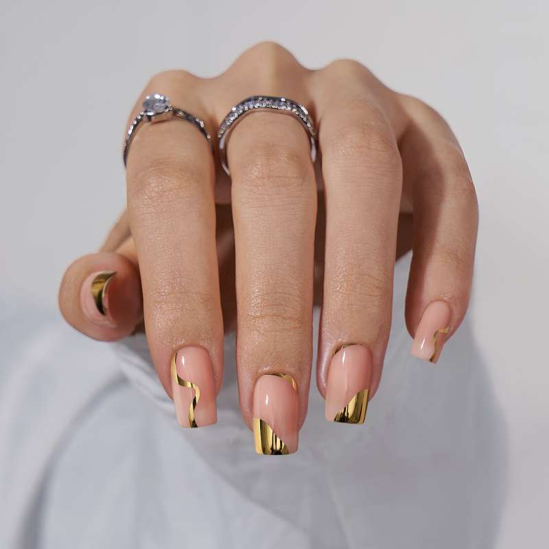 Our square gold French tip gel press-on nails add a bold metallic touch to your nails.